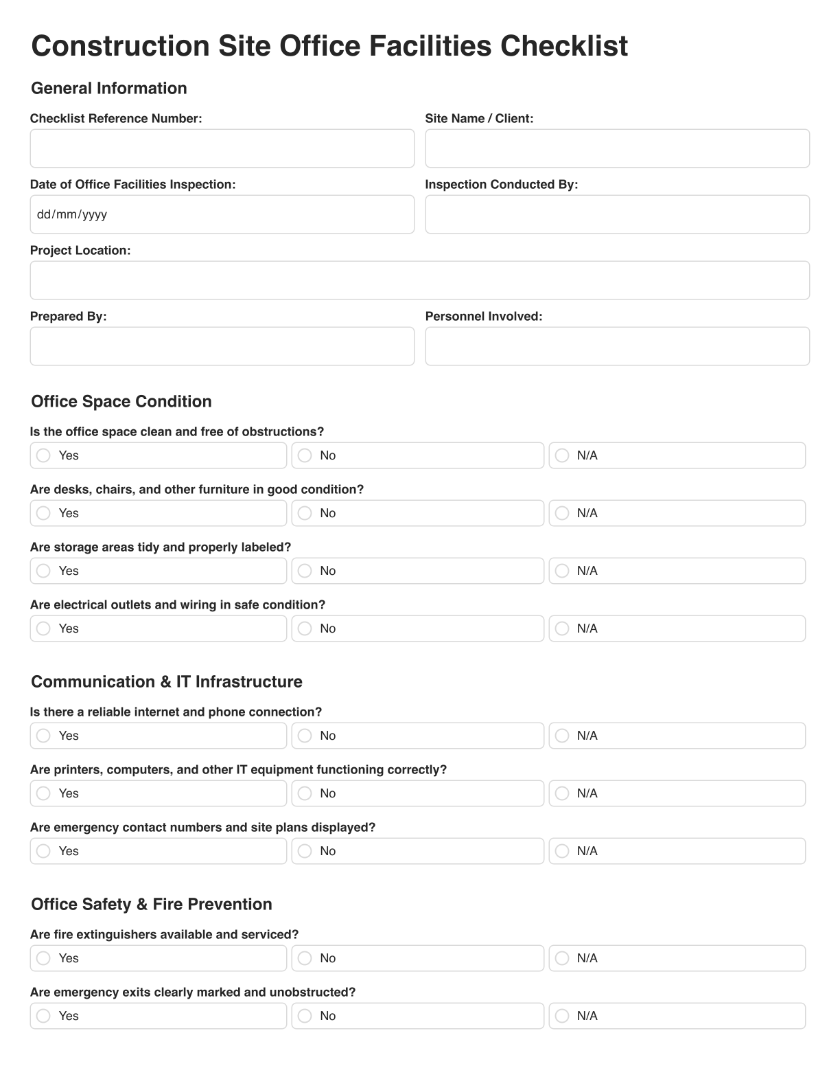 The checklist provides a thorough framework for inspecting all aspects of your site office facilities, from general cleanliness to equipment functionality. This helps ensure that all facilities are in good condition and fit for purpose.